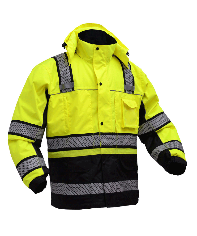 Outer shell with thermal insulation with removable zip up sweatshirt, segment reflective bands on both arms.