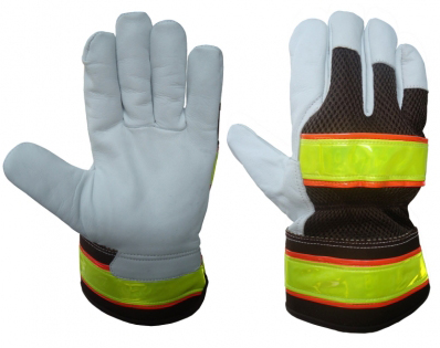 Canadian Rigger Glove,Palm made of goatskin leather back flourscent fabric,return on index finger,Knuckle Strap,Rubberized cuff. Sizes: 7,8,9,10 & 10.5.